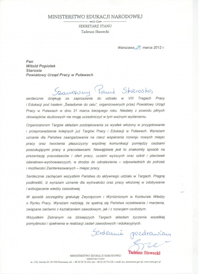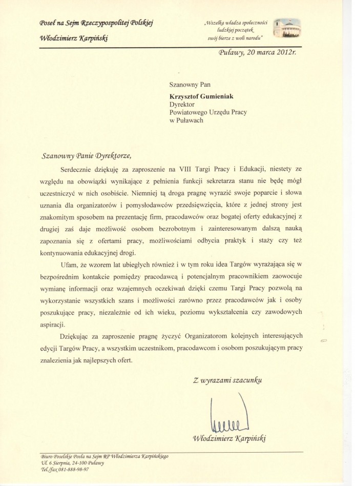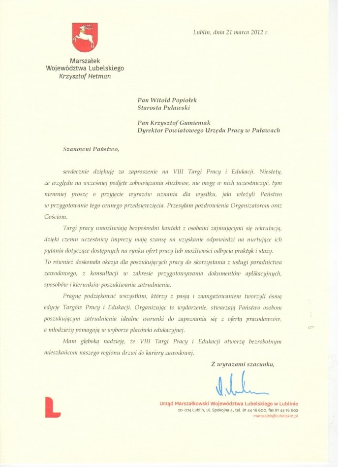 Rangę naszego przedsięwzięcia zgodnie podkreślali zaproszeni goście, wśród których byli m.in. Lubelski Kurator Oświaty Pan Krzysztof Babisz, radni Sejmiku Województwa Lubelskiego Pan Piotr Rzetelski (jednocześnie reprezentujący Marszałka Województwa Lubelskiego) oraz Pani Beata Trzcińska ? Staszczyk, Zastępca Dyrektora WUP w Lublinie Pan Kazimierz Stocki, Komendant Wojewódzki OHP w Lublinie Pan Tomasz Piecak, Starosta Rycki Pan Stanisław Jagiełło oraz wielu innych. Część oficjalną prowadził Dyrektor Powiatowego Urzędu Pracy w Puławach Pan Krzysztof Gumieniak. Poniżej prezentujemy listy intencyjne złożone na nasze ręce, w związku z organizacją VIII Targów Pracy i Edukacji w Puławach.