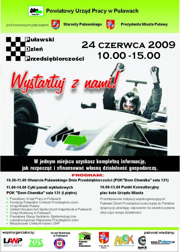Celem Puławskiego Dnia Przedsiębiorczości (PDP) jest zapewnienie Państwu kompleksowych informacji dotyczących wszelkich wymagań, formalności i warunków, które należy spełnić, aby założyć własną firmę. W Punkcie Konsultacyjnym, specjaliści z instytucji współorganizujących PDP będą udzielać szczegółowych informacji na tematy najbardziej Państwa interesujące, będą odpowiadać na pytania związane z pojawiającymi się wątpliwościami czy niejasnościami. Podstawowe wiadomości będzie można zdobyć wysłuchując paneli wykładowych przygotowanych przez zaproszonych specjalistów. Można też będzie skorzystać z indywidualnych konsultacji ? jest to niepowtarzalna okazja dla osób rozważających samozatrudnienie jako drogę kariery zawodowej, ale również dla już funkcjonujących na rynku przedsiębiorców. Tym samym chcemy Państwu ułatwić nawiązanie bądź wzmocnienie współpracy z instytucjami, które są bezpośrednio zaangażowane w ten proces, czyli: