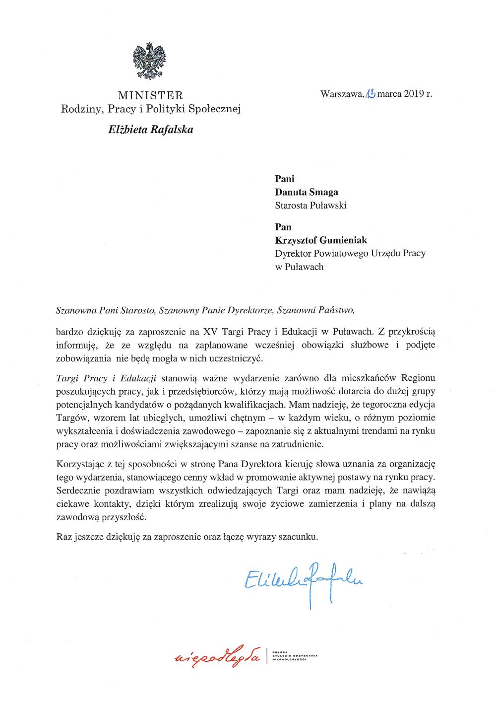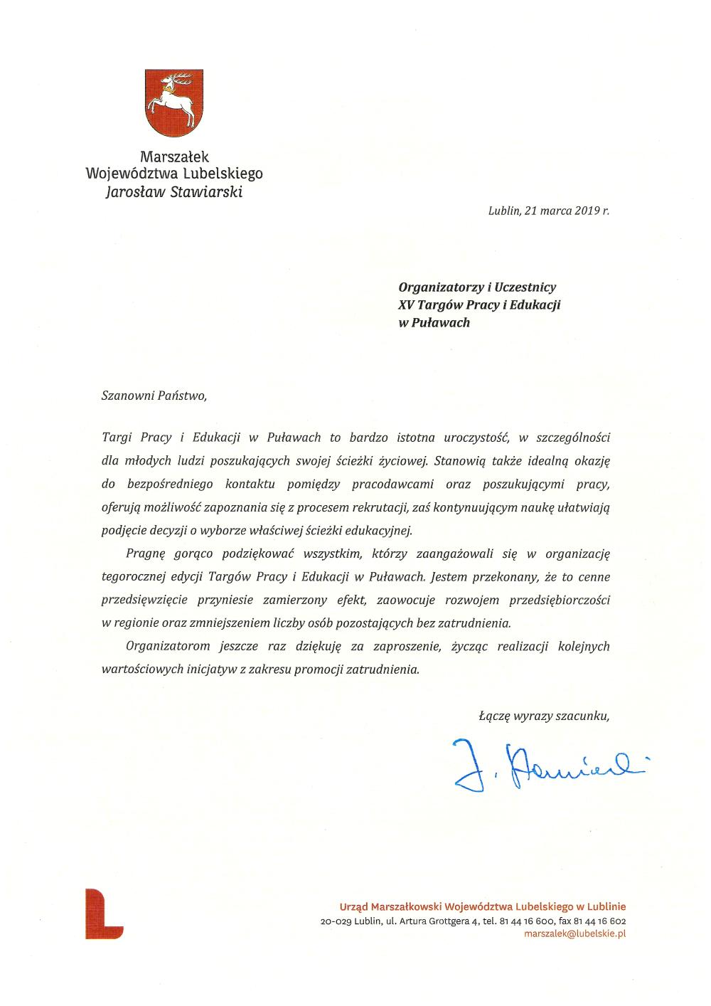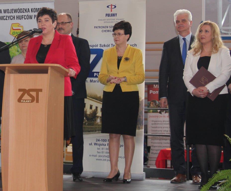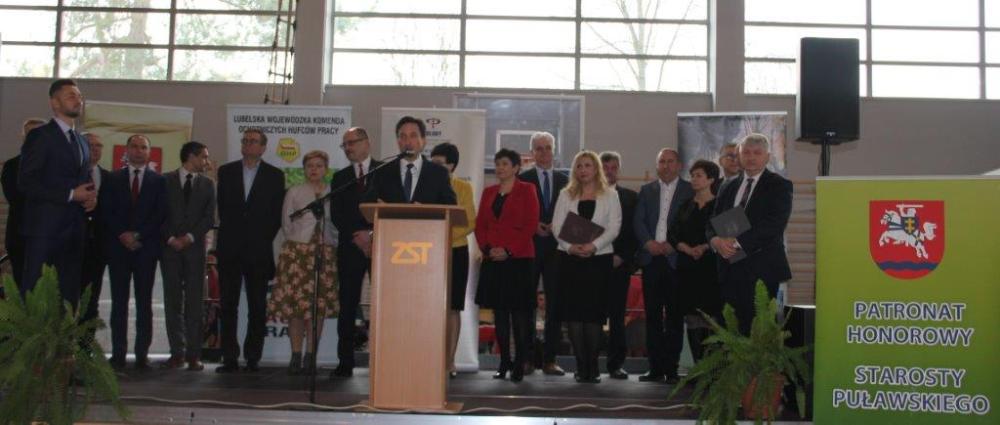 Oficjalnego otwarcia XV Targów Pracy i Edukacji w Puławach dokonała Starosta Puławski Pani Danuta Smaga. Ponadto spośród zaproszonych gości głos zabrali poseł na Sejm RP prof. Krzysztof Szulowski, p.o dyrektora Wojewódzkiego Urzędu Pracy w Lublinie Pani Katarzyna Tokarczuk, reprezentująca Marszałka Województwa Lubelskiego Pana Jarosława Stawiarskiego, Lubelski Kurator Oświaty Teresa Misiuk reprezentująca Ministra Edukacji Narodowej oraz wójt Gminy Puławy Pan Krzysztof Brzeziński.